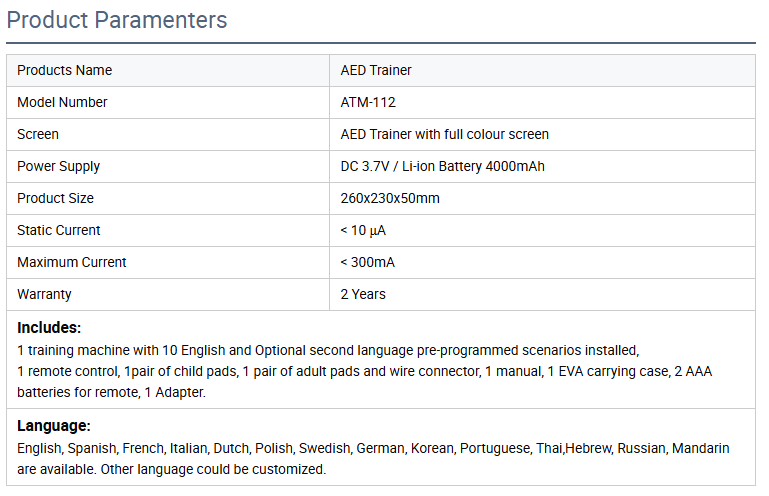 AED Trainer with full colour screen; English, Spanish, French, Italian, Dutch, Polish, Swedish, German, Korean, Portuguese, Thai, Hebrew, Russian, Mandarin are available.